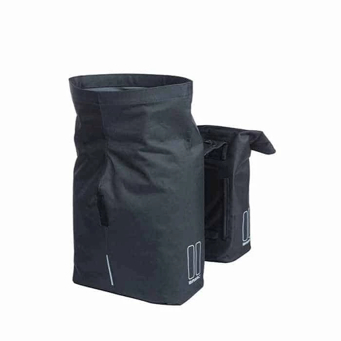 Die schwarze Fahrrad-Doppeltasche wird aus Polyester